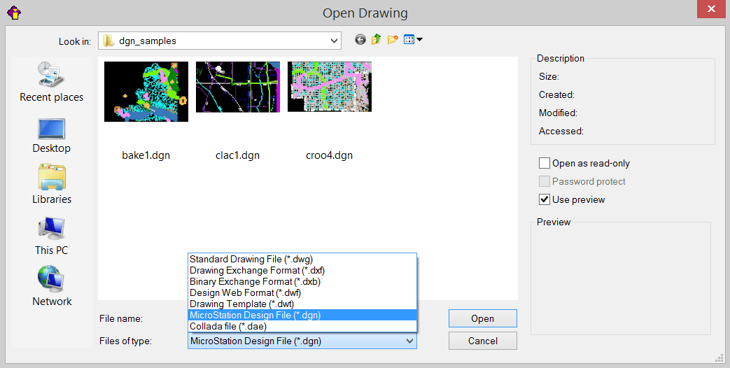 As CMS IntelliCAD is able to import DXF, DXB, DWF, DWT and DAE format files, it can also import Bentley MicroStation *.DGN format files by converting them to .dwg files.