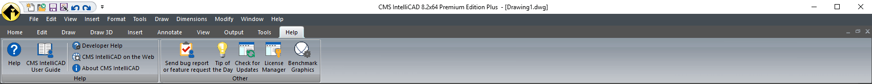 The CMS IntelliCAD® ribbon contains several areas from which to choose commands: Ribbon Application button, Quick Access toolbar and Tabs. Note that some few features are ONLY available at the PE Plus edition.